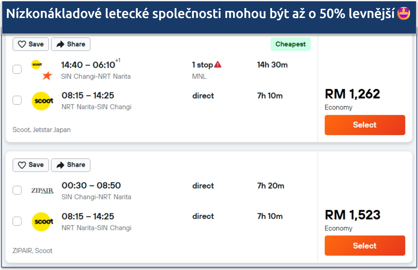 Nízkonákladové letecké společnosti nabízejí mnohem levnější lety než velké letecké společnosti, zejména ty působící v konkrétních regionech. Hlavně u krátkých letů často najdete mnohem nižší základní ceny letenek. Problém je, že za stejný prostor v zavazadlovém prostoru nebo jiné vybavení obvykle musíte zaplatit navíc. Například společnosti ANA a JAL si za let mezi Singapurem a Tokiem účtovaly více než 500 dolarů. Ve stejném termínu nabízely nízkonákladové letecké společnosti Scoot a Zipair lety za méně než 400 dolarů.